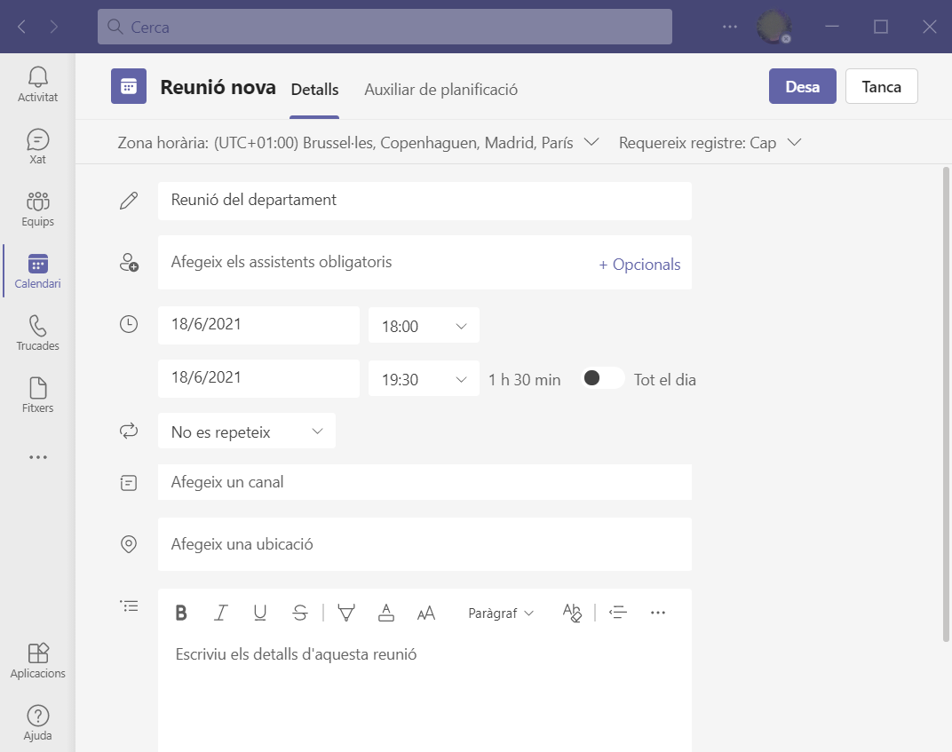 1. Crearem la reunió des del calendari de Microsoft Teams amb les opcions que nosaltres necessitem. Podem afegir els usuaris i desar la reunió