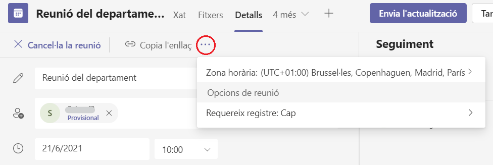 2. Si necessitem opcions avançades com la sala d'espera haurem d'editar la reunió. En fer-ho ens apareix una nova característica anomenada "Opcions de reunió" cliquem i ens obrirà una nova pàgina del navegador que utilitzem ( Edge, Chrome, Firefox, Safari, etc. ). Si no ens apareix aquest apartat, cliquem els tres punts per desplegar el menú emergent com mostra la següent captura.