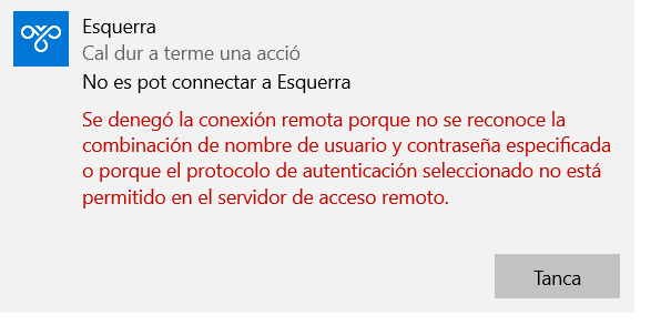 La connexió a la VPN dona error que no es pot connectar quan les dades d'accés són correctes (Usuari i Contrasenya).