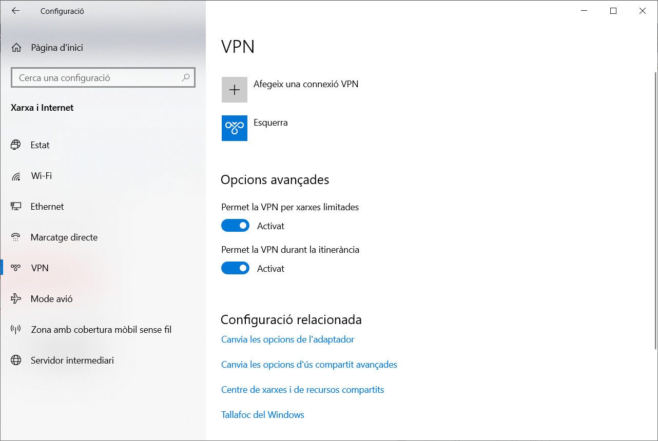 Des del panell de "Configuració del Windows" -- > "Xarxa i Internet" -- > "VPN" i cliquem sobre "Canvia les opcions de l'adaptador"